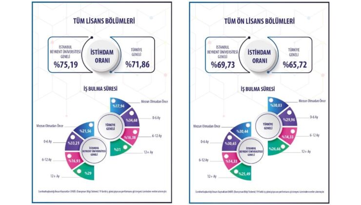 Cumhurbaşkanlığı İnsan Kaynakları DABİS (Danışman Bilgi Sistemi) 19 farklı iş günü piyasası performans göstergesi üzerinden aldığı verilerle hazırlanan rapora göre İstanbul Beykent Üniversitesi öğrencilerinin iş bulma sürelerini aktaran Butur, “Öğrencilerin lisans ve ön lisans düzeyinde iş bulma süreleri Türkiye genel ortalamasının üzerinde. Lisans öğrencilerinin yüzde 22’sine yakını, ön lisans öğrencilerinin yüzde 30’undan fazlası henüz öğrenciyken iş buluyor. En yüksek istihdam oranına sahip ise mühendislik fakültesi bölümleri öğrencilerine ait. Yaklaşık oranlarla ön lisans programlarında da ilgili alanların istihdam oranları benzer şekilde” diye konuştu.