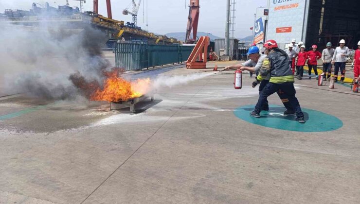 Acil durumlara karşı vatandaşların can ve mal güvenliği için görev yapan Kocaeli Büyükşehir Belediyesi İtfaiye Dairesi Başkanlığı, eğitim faaliyetlerine hız kesmeden devam ediyor. Gelen eğitim talepleri doğrultusunda hem Kocaeli’de hem de il dışındaki kurum ve kuruluşlara eğitim hizmeti veren büyükşehir itfaiyesi, UZMAR Gemi İnşa Sanayi firmasından gelen talep üzerine firma bünyesindeki acil durum ekiplerine eğitim verdi. KOBİTEM eğitmenleri tarafından verilen eğitim fabrika sahasında gerçekleştirildi. Düzenlenen acil durum ekip eğitiminde personele; “Yanma ve yangın”, “Yangın davranışı”, “Yangın yerindeki tehlikeler”, “Söndürme maddeleri”, “Taşınabilir yangın söndürücülerin kullanımı” ve “Yangın hortum dolaplarının kullanımı” konuları başta olmak üzere önemli bilgiler aktarıldı. Eğitim sonunda da acil durum tatbikatı gerçekleştirildi.