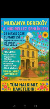 Mudanya’nın şirin ve üretken köylerinden Dereköy, baharın gelişini geleneksel 4. Hıdırellez Şenlikleri ile karşılamaya hazırlanıyor. 24 Mayıs 2025 Cumartesi günü saat 16.00 – 23.30 arasında Dereköy Çeşme Meydanı’nda gerçekleşecek olan bu özel etkinlik, köy halkını ve misafirleri doğa, kültür ve eğlenceyle buluşturacak.
