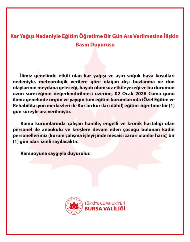 Bursa Valiliğinden yapılan açıklamada, “İlimiz genelinde etkili olan kar yağışı ve aşırı soğuk hava şartları sebebiyle, meteorolojik verilere göre olağan dışı buzlanma ve don olaylarının meydana geleceği, hayatı olumsuz etkileyeceği ve bu durumun uzun süreceğinin değerlendirilmesi üzerine, 2 Ocak 2026 Cuma günü ilimiz genelinde örgün ve yaygın tüm eğitim kurumlarında (Özel Eğitim ve Rehabilitasyon merkezleri ile Kur’an kursları dahil) eğitim-öğretime 1 gün süreyle ara verilmiştir.