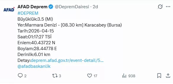 Afet ve Acil Durum Yönetimi Başkanlığı (AFAD) verilerine göre, Bursa’nın Karacabey ilçesi merkezli 3.5 büyüklüğünde bir deprem meydana geldi.